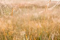 Macrofoto van een spinnenweb tussen twee graspluimen in. De details zijn mooi scherp in beeld gebracht. Er zijn allemaal kleine dauwdruppeltjes op het spinnenweb. De foto is gemaakt net na zonsopgang wat voor de warme kleur van de foto zorgt.