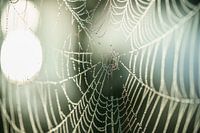 Een spinnenweb met dauwdruppels in het licht van de opkomende ochtendzon Door de kleine scherptediepte en het warme licht krijgt de foto een dromerige uitstraling en een prachtig bokeh. Door het tegenlicht zie je de prachtige details en de knappe weeftechniek die door de spin gebruikt is.
