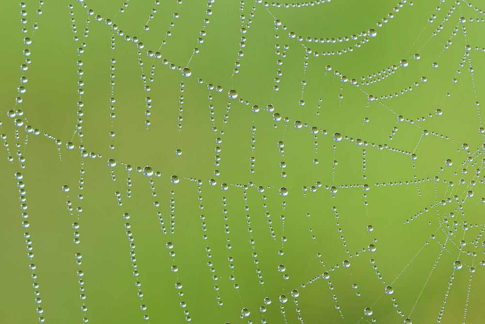 Voor een groene achtergrond een spinnenweb met waterdruppels