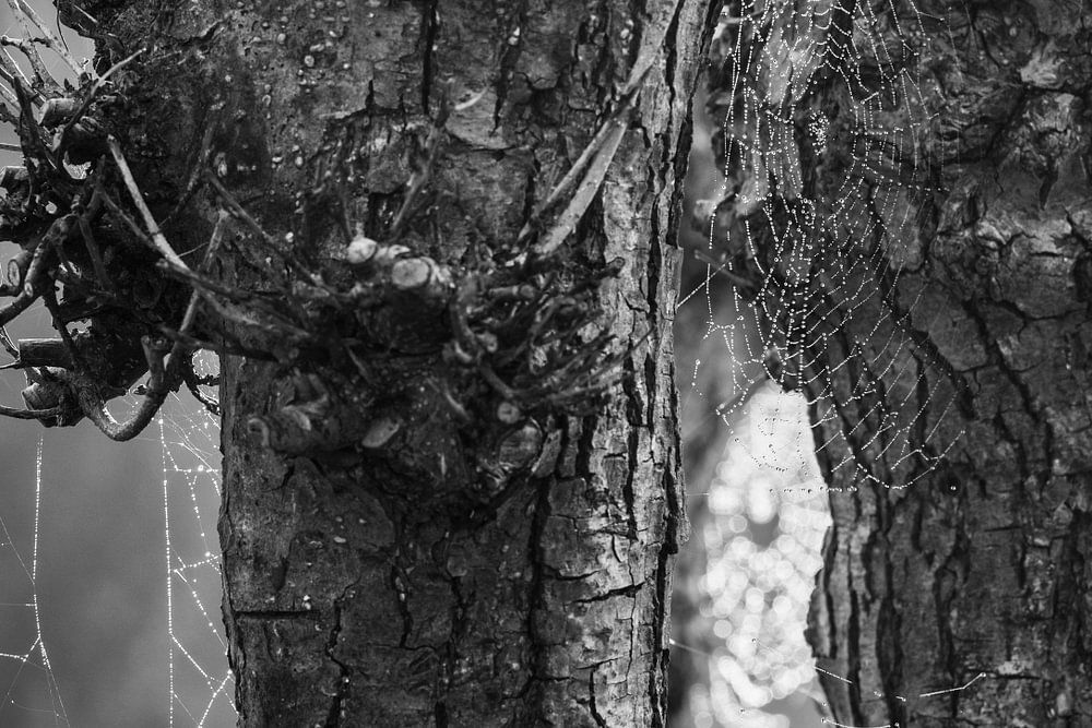 Spinnenwebben op een koude dag met dauw in de ochtend
