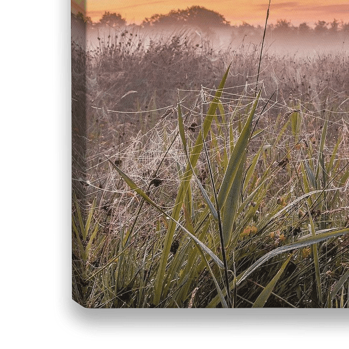 Koop dit landschapskunstwerk Spinnenwebben en mist tijdens zonsopkomst van Dafne Vos op canvas, aluminium dibond, (ingelijste) fotoprint, behang en ArtFrame, op maat geprint in Fine-Art kwaliteit.