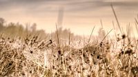 Spinnenwebben in het gras op een weide in het tegenlicht van de stralen opkomende zon. Sfeervol seizoensplaatje van een prachtige ochtend scene.