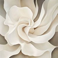 Abstracte weergave van bloembladen uit die in een spiraalvormig patroon lijken te draaien. De bloembladen zijn geschilderd in zachte, crèmekleurige en beige tinten, wat een gevoel van verfijning en zachtheid creëert. De delicate overgangen tussen licht en schaduw zorgen voor een vloeiend en bijna hypnotiserend effect, waarbij de kijker wordt uitgenodigd om in de draaikolk van de bloembladen te duiken.