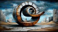 De afbeelding toont een gigantische spiraal, die een indrukwekkende metafoor is voor tijd. Het roestige, verweerde oppervlak van de spiraal doet denken aan kapotte klokken, met wijzerplaten die uit elkaar vallen alsof de tijd zelf erodeert. Deze spiraalvormige structuur lijkt een gevangen beweging die begin noch einde kent en de eeuwige stroom van de tijd in twijfel trekt.