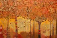 Dit werk toont een boslandschap met bomen die zijn bedekt met spiraalvormige patronen in verschillende tinten oranje, rood en geel. De bomen hebben lange, slanke stammen en het bladerdak bestaat uit cirkels en spiralen die een gevoel van beweging en textuur creëren. De warme kleuren roepen de sfeer van de herfst op en de spiraalvormen voegen een speels element toe aan het geheel.