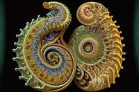 Spiraalharmonie: Deze fascinerende fractalillustratie toont twee gedetailleerde spiralen - een in helder geel en de andere in rijk groen - die in perfecte balans in elkaar verstrengelen en doen denken aan yin-yang of schelpformaties. Tegen een diepzwarte achtergrond voegt het psychedelisch geïnspireerde ontwerp contrast en diepte toe,…