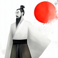 Dit minimalistische kunstwerk toont een samoerai in traditionele Japanse kleding met zijn rug naar een felrode zon. De afbeelding brengt een sterke sfeer van rust, kracht en innerlijke sereniteit over, gecombineerd met de esthetiek van de Japanse Zen-stijl. De eenvoud van de kleuren en vormen laat ruimte voor interpretatie en trekt het…