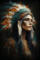 Een krachtig digitaal kunstwerk dat traditionele inheemse cultuur versmelt met moderne artistieke expressie. De combinatie van turquoise en oranje veren in de hoofdtooi contrasteert dramatisch tegen de donkere achtergrond, terwijl subtiele verfdruppels en vervagingen een hedendaagse twist geven aan dit portret. De mystieke sfeer wordt…