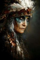Een adembenemend digitaal kunstwerk dat ancestrale kracht uitstraalt door een meesterlijke compositie van veren, turquoise gezichtsverf en verweerde texturen. De intense blik, omlijst door een indrukwekkende hoofdtooi van witte en bruine veren, vertelt een verhaal van wijsheid en wildheid. Traditionele elementen in combinatie met…