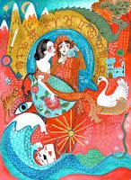 Spiritueel! Theebladeren lezen, theeblaadjes kijken of tasseografie heeft alles met waarzeggerij te maken. Sterrenbeelden, astrologie, symbolen in een fantasievolle setting. Origineel acrylverf op papier.