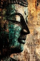 Dit ontwerp toont een close-up van een Boeddha-sculptuur, prachtig gecombineerd met verweerde en aardse texturen in warme goud- en groentinten. De serene expressie van de Boeddha straalt rust en balans uit, terwijl de verweerde texturen een mystieke en tijdloze sfeer toevoegen. Ideaal voor een interieur dat een spirituele en artistieke uitstraling verlangt, en perfect geschikt als blikvanger in woonkamers, slaapkamers of werkruimtes.