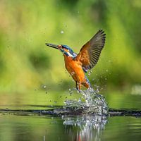Ijsvogel komt weer uit het water na een duik voor vis. Met veel gespetter komt hij weer boven.