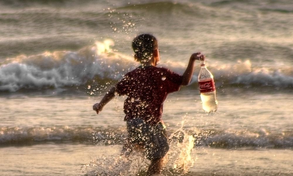 Aan de kust van Vietnam rent een jongetje met zijn Coca cola fles de zee in.