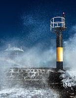 Golf breekt op de muur bij de vuurtoren van Arrieta, Lanzarote, Canarische Eilanden, met de "Blauwe Ruine" op de achtergrond