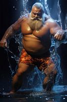 Een gespierde man met een dikke witte baard is midden in beweging vastgelegd, omringd door opspattend water tegen een donkere achtergrond. Hij draagt een kleurrijke korte broek en ziet er intens uit als het licht zijn natte huid benadrukt.