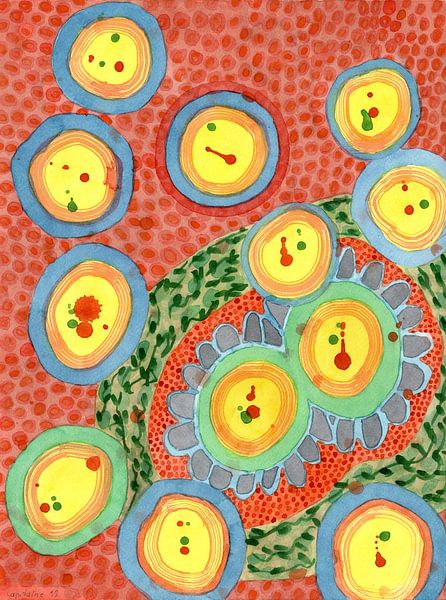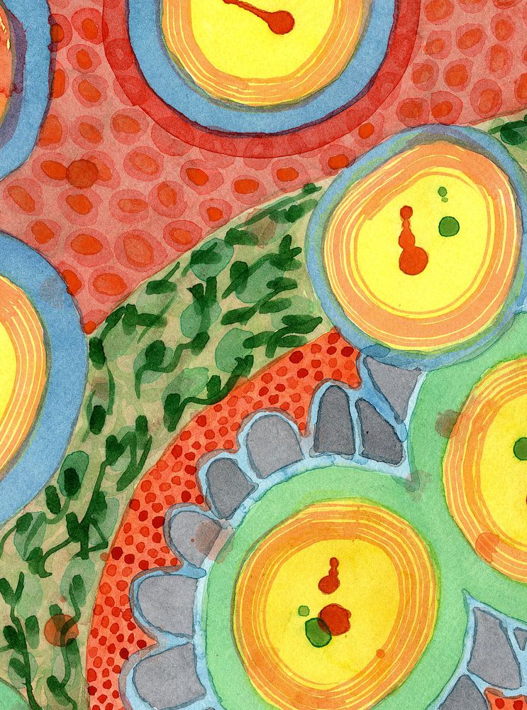 Yellow circles decorated with red and green splashes, are surrounded by fields of ornaments and dots. It's a beautifully balanced image with lovely colors.