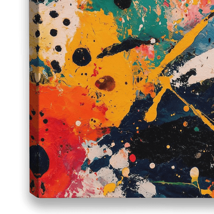 Een kunstwerk met een levendige en abstracte explosie van kleuren en texturen, die doet denken aan een schilderij in de stijl van Jackson Pollock. Krachtige penseelstreken in verschillende vormen en maten creëren een dynamische en energieke compositie.