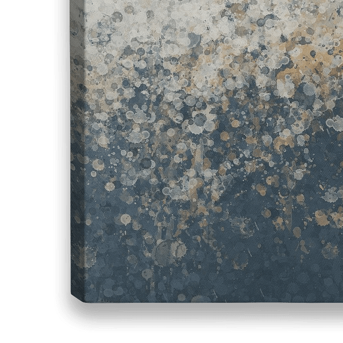 Een abstract schilderij van een landchap in donkerblauw, caramel en grijs. Een prachtig, rustgevend schilderij met veel detail van verfspetters. Een enorme meerwaarde voor de sfeer in huis, zonder te aanwezig te zijn in het interieur.