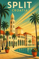 Deze Split Kroatië reisposter brengt de Adriatische kust tot leven met een levendige Art Deco stijl. Met palmbomen omzoomde promenades, zonovergoten stenen bogen en de iconische klokkentoren, viert het kunstwerk de charme van de meest historische kuststad van Kroatië. Split staat bekend om zijn mix van Romeins erfgoed en mediterrane schoonheid en deze illustratie legt die unieke sfeer vast in warme gouden tinten en turquoise blauwtinten. De stralende lichtbundels benadrukken de levendige waterkant van de stad en de tijdloze elegantie, waardoor deze poster een pronkstuk wordt voor elk interieur. Perfect voor reizigers, mediterrane liefhebbers of bewonderaars van kuststeden, deze muurkunst van Split Kroatië voegt een gevoel van zon en avontuur toe aan je interieur. Of het nu in een woonkamer, kantoor of reisgeïnspireerde galerijmuur hangt, het roept herinneringen op aan zeebriesjes, historische straten en Adriatische zonsondergangen. Een stijlvol cadeau voor liefhebbers van reizen en Europese architectuur.