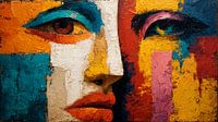 Een abstract portret in panoramische stijl van een gezicht dat in twee helften is verdeeld, geschilderd met dikke impasto verf wat de abstracte, artistieke stijl van het portret benadrukt. De algehele sfeer is krachtig, expressief en modern.