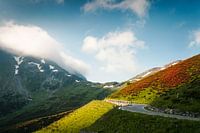 De pasweg in het ochtendlicht op een zomermorgen. Rechts op de foto zie je bloeiende alpenrozen.