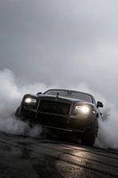 Een krachtige Rolls-Royce komt tevoorschijn uit een dikke wolk van bandenrook op het asfalt. De felle koplampen snijden door de nevel en laten een zeldzame, agressieve kant van dit luxe icoon zien. Het is de definitie van "Elegant Rebellion."