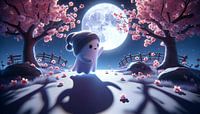 In deze droomachtige scène verschijnt een kleine geest onder de mystieke gloed van de volle maan, omringd door de delicate pracht van bloeiende kersenbomen. De geest, gekleed in een gezellige gebreide muts, staat op een pad dat wordt verlicht door het zachte licht van de maan. Zijn blik lijkt in de verte gericht, verloren in de stilte…
