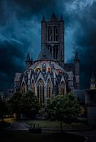 De Sint-Niklaaskerk in Gent in de avond met een komende dreigende lucht. Het geheel maakt het wat spookachtig.