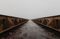 Deze foto toont de Moerputtenbrug in haar meest verstilde gedaante: een lange, roestige spoorbrug die zich uitstrekt in de mistige verte. De brug is opgebouwd uit geklonken stalen balken en trussen, met een metalen roosterplatform als looppad. De symmetrische compositie trekt het oog naar het verdwijnpunt, waar de brug lijkt op te…