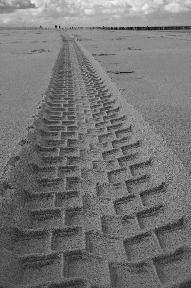 spoor van een band op het strand tijdens een lichtbewolkte zomerdag. Foto genomen met laag standpunt en polarisatiefilter