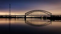 Spoorbrug in het ochtendgloren. Het is de spoorbrug bij Arnhem (Oosterbeek) over de Rijn. Foto genomen in de vroege ochtend vanaf de punt van een krib.