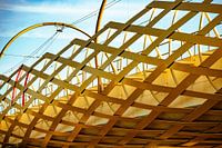Horizontale foto van een detail van de spoorbrug over de Dieze vlakbij het centrum van ‘s-Hertogenbosch. De gevlochten goudkleurige stalen stroken, om de betonnen constructie, stralen warm in de ochtendzon.