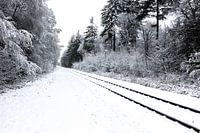 Een spoorlijn verdwijnt tussen besneeuwde bomen in een bosrijke omgeving. De foto lijkt zwart-wit maar is dat niet; de wereld is gereduceerd tot een monochroom beeld door de sneeuwval en het ontbreken van bladeren.