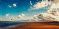 Man op het strand van Contis-Plage, Atlantische kust, Frankrijk tijdens een wandeling. Strandpanorama samengesteld uit verschillende foto's en bewerkt met textuur-overlays.