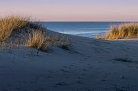 Zachte voetstappen leiden je door het stille duinlandschap, richting de eindeloze horizon waar zee en lucht elkaar ontmoeten. Het koele blauw van het water contrasteert subtiel met het warme licht dat het helmgras en het zand raakt. Een beeld dat rust en ruimte ademt, en uitnodigt tot vertragen—perfect om een kalme, natuurlijke sfeer in…