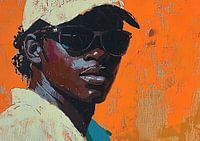 Sportieve Man met Cap - Op dit sport schilderij zie je een man met een cap en zonnebril, die zelfverzekerd kijkt tegen een achtergrond van heldere oranje en gele kleuren, wat het schilderij een energieke uitstraling geeft.