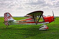 Felgekleurd sportvlietuigje op het gras met wolken erboven. Het HDR effect geeft een surrealistisch beeld