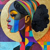 Kleurrijk abstract collage portret van een vrouw in profiel met een grove papier textuur en goud accent.