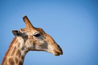 Rustig uitkijkend over de Afrikaanse savanne. Deze giraffe kijkt ongestoord voor zich uit. De mooie kop afstekend tegen de knalblauwe Zuid Afrikaanse lucht.