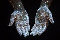 Deze unieke afbeelding toont een paar handen bedekt met schitterende glitters, wat een magisch en betoverend effect creëert. Het lijkt alsof de handen rechtstreeks uit een sterrenhemel komen, omhuld in een regen van sprankelende deeltjes die het licht vangen en reflecteren. De combinatie van zilverachtige en kleurrijke accenten maakt het geheel bijzonder dynamisch en fascinerend. Dit ontwerp is perfect voor moderne interieurs, en voegt een vleugje magie toe aan elke ruimte waar het hangt. Ideaal voor iedereen die van een creatieve en dromerige sfeer houdt.