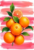 Dit prachtige kunstwerk toont een cluster van glanzende sinaasappels, perfect in detail weergegeven, met hun levendige oranje tinten die tot leven komen tegen een speelse, roze achtergrond. De zorgvuldig aangebrachte bladeren voegen een natuurlijke frisheid toe, waardoor het stuk niet alleen een visueel spektakel is, maar ook een uitnodigende uitstraling heeft. De combinatie van sterke kleuren en de speelse penseelstreken in de achtergrond roept een gevoel van vreugde en energieke positiviteit op, waardoor het ideaal is voor elk modern interieur of een levendige keuken. Dit werk is geïnspireerd door de schoonheid van de natuur en de eenvoud van alledaagse vruchten. Het gebruik van high definition technieken zorgt ervoor dat elk detail perfect naar voren komt, waardoor dit kunstwerk een ware blikvanger is. Het straalt niet alleen schoonheid uit, maar ook een gevoel van welzijn en overvloed, wat het een waardevolle aanvulling maakt voor uw ruimte. Voeg dit kunstwerk toe aan uw collectie om een sprankelende sfeer te creëren die uw woning verrijkt.