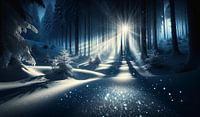 Een bos bedekt met diepe sneeuw wordt overspoeld door de gloed van de winterzon. De zon staat laag en stuurt haar stralen door de dichte dennenbomen, zodat het weerkaatsende licht van de sneeuwkristallen de grond verandert in een zee van glinsterende diamanten. Het tafereel is stil en vredig, de frisse kou in de lucht is bijna voelbaar en de schoonheid van de natuur in winterslaap is overweldigend. De sneeuw op de takken van de bomen werkt als een zachte deken die alles omhult in een kalm, bijna surrealistisch tafereel.