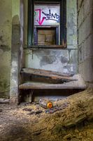 Een lege grafittibus ligt bij de resten van het preekgestoelte van een verlaten en vervallen kapel.