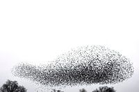 Spreeuwen zermen in een bewolkte lucht aan het eind van de dag. Enorme groepen spreeuwen in de lucht die in vormveranderende wolken bewegen alvorens in de bomen te landen voor de nacht.