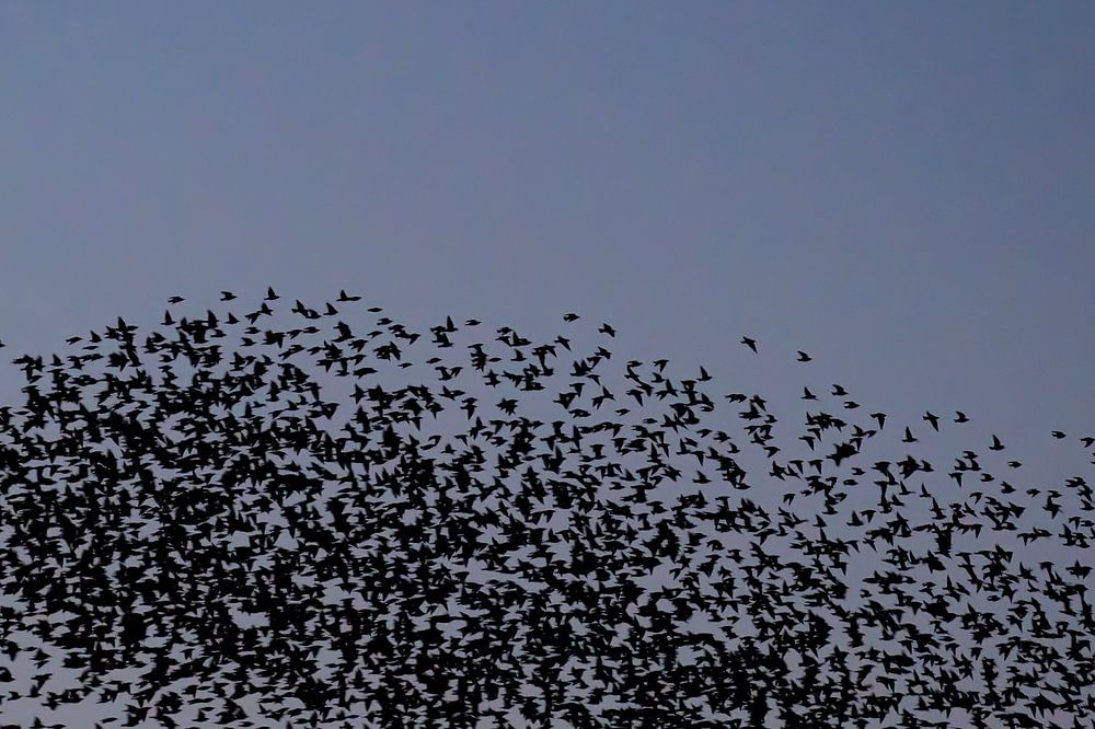 Spreeuwen komen samen in een heldere lucht tijdens een kalme zonsondergang aan het eind van de dag. Enorme groepen spreeuwen in de lucht die in vormveranderende wolken bewegen alvorens in de bomen te landen voor de nacht. De vogels vliegen samen in een gecoördineerd patroon, veranderen van richting en snelheid als één enkele eenheid, en creëren wervelende en pulserende vormen in de lucht. Deze bewegingen zouden voor de vogels een manier zijn om roofdieren te ontwijken en bij elkaar te blijven in de troep, en de gesynchroniseerde patronen creëren een betoverend visueel schouwspel.