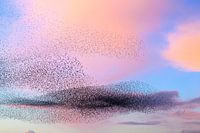 Spreeuwen in een grote groep tijdens zonsondergang van Sjoerd van der Wal Fotografie