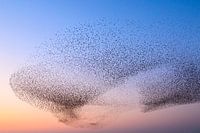 Spreeuwen in een kleurrijke lucht tijdens een kalme zonsondergang aan het einde van de dag. Enorme groepen spreeuwen (Sturnidae) in de lucht die bewegen in vormveranderende wolken voor de nacht.