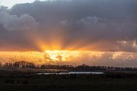 Boven ‘t Roegwold (Groningen) verzamelen de spreeuwen zich voor de nachtrust. Door de geweldige zonnestralen wordt het spektakel nog groter.