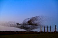Spreeuwen vliegen in een grote groep in de lucht tijdens een kalme zonsondergang aan het einde van de dag. Enorme groepen spreeuwen (Sturnidae) in de lucht die bewegen in vormveranderende wolken voor de nacht. Sperwers jagen op spreeuwen waardoor de grote zwerm vogels reageert.
