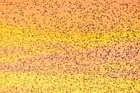 Een grote groep spreeuwen in tegen door de ondergaande zon beschenen wolken